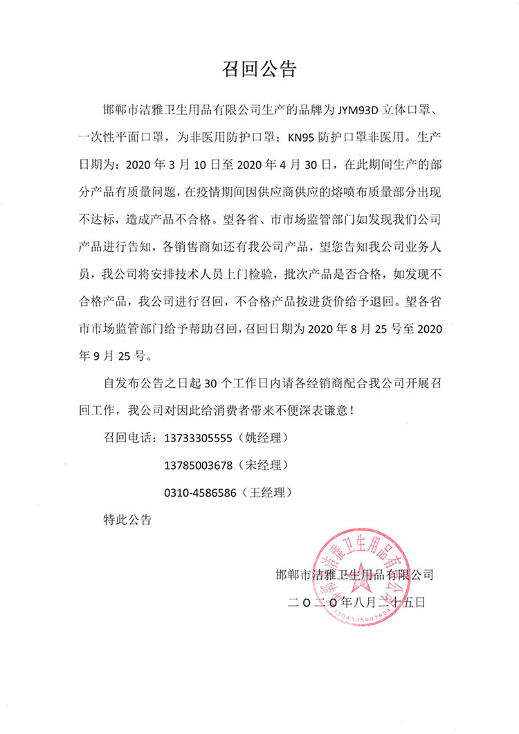 邯鄲市潔雅衛(wèi)生用品有限公司生產(chǎn)的品牌為JYM93D立體口罩一次性平面口罩,為非醫(yī)用防護(hù)口罩;KN95 防護(hù)口罩非醫(yī)用。生產(chǎn)日期為:2020年3月10日至2020年4月30日,在此期間生產(chǎn)的部分產(chǎn)品有質(zhì)量問題,在疫情期間因供應(yīng)商供應(yīng)的熔噴布質(zhì)量部分出現(xiàn)不達(dá)標(biāo),造成產(chǎn)品不合格。望各省、市市場監(jiān)管部門如發(fā)現(xiàn)我們公司產(chǎn)品進(jìn)行告知,各銷售商如還有我公司產(chǎn)品,望您告知我公司業(yè)務(wù)人員,我公司將安排技術(shù)人員上門檢驗(yàn),批次產(chǎn)品是否合格,如發(fā)現(xiàn)不合格產(chǎn)品,我公司進(jìn)行召回,不合格產(chǎn)品按進(jìn)貨價(jià)給予退回。望各省市市場監(jiān)管部門給予幫助召回召回日期為2020年8月25號(hào)至2020年9月25號(hào)